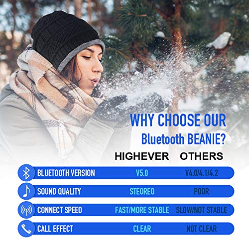 10-Hours Music on 2-Hour Recharge: HIGHEVER Bluetooth beanie headphones offers an upgraded USB chargeable battery, charge about 1.5-2 hours provide more than 12 hours playing time and 60 hours standby time. Easily recharge the Bluetooth beanie hat by a Micro USB cable(included). Put on a Bluetooth beanie, enjoy the wonderful music, HIGHEVER Bluetooth beanie hat is definitely a tech gifts for man/dad/father/guys/mom/teens on Thanksgiving Christmas Birthday!