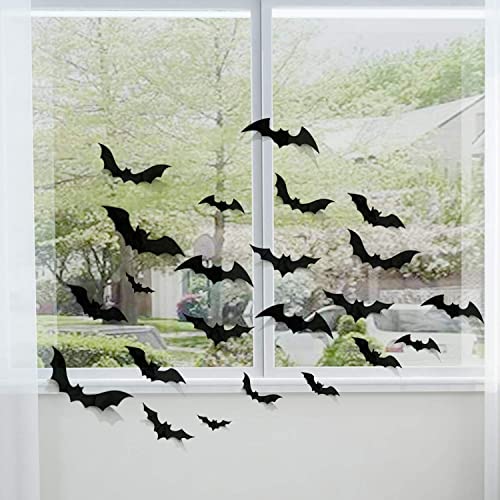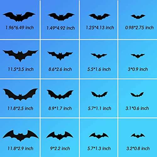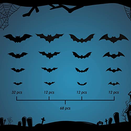 68 Pcs Halloween Bats decoration set Create Creepy Yet subtle Halloween This Halloween 3D bat sticker decoration set have some lines that can fold the wings out a little to get more of the 3D effect to decorate party. The Bats appears to be flying rather than being stuck flat to the ceiling.They are an excellent addition for Halloween. DIY 3-D Bats look This Halloween 3D bat sticker decoration set have some lines that can fold the wings out a little to get more of the 3D effect to decorate party.The Bats appears to be flying rather than being stuck flat to the ceiling.They are an excellent addition for Halloween. Variety Of Sizes Bats Decoration The Halloween bats sticker have enough amount and size.They are cute and come in 4 different shapes and 68 Pcs bats together.The Halloween Bats unique sight would definitely attract and spook your neighbors and friends at Halloween!