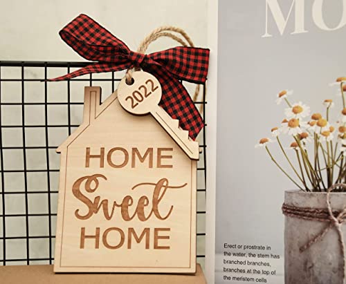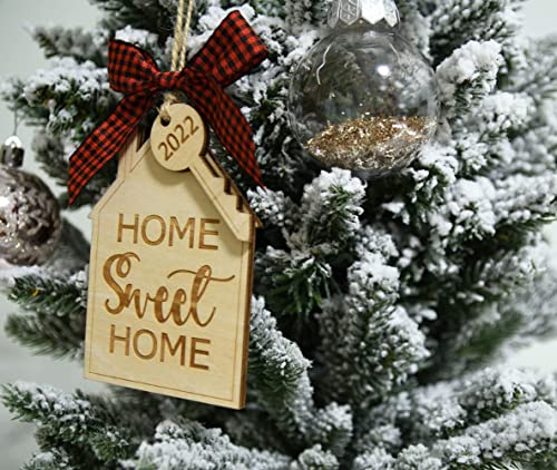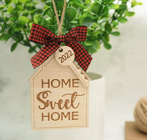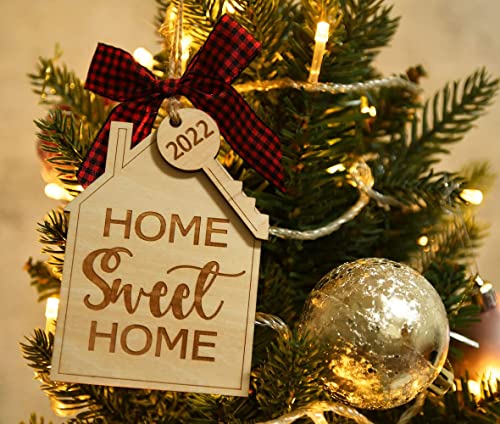 Materials: Each first home Christmas ornament 2022 is laser cut from natural wood and professionally printed, and includes a jute string for hanging and a red buffalo check bow.