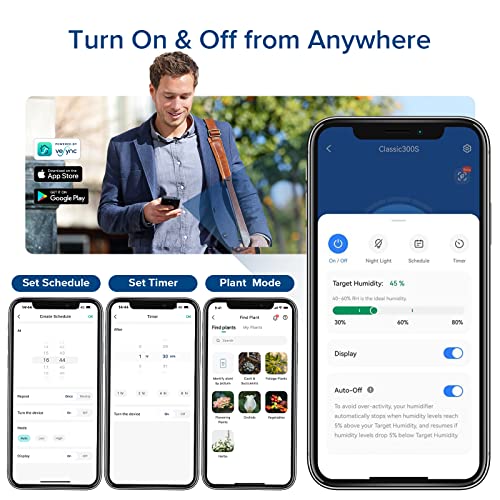 BETTER SMART CARE: Simply use the free VeSync APP to control settings anytime & anywhere, create schedules, etc. And the Auto Mode will maintain the room humidity at the healthiest humidity level in you.