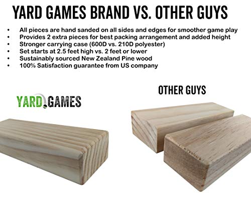 Specification: Yard Games Giant Tumbling Timbers with carrying case starts at 2.5-feet tall and builds to 5-feet